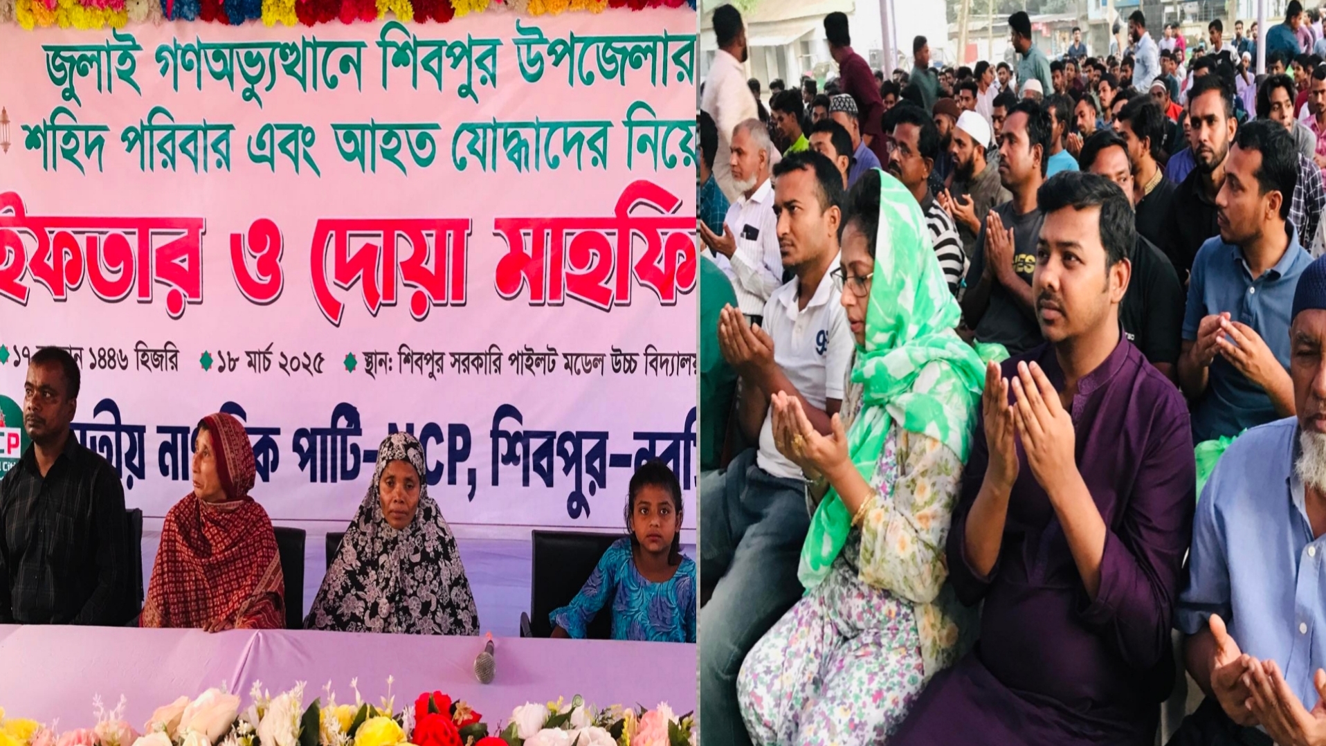 মোমেন খান, নিজস্ব প্রতিবেদক : জাতীয় নাগরিক পার্টি (এনসিপি) এর উদ্যোগে নরসিংদীর শিবপুর উপজেলায় জুলাই গণ-অভ্যুত্থানে শহিদ পরিবার ও আহত যোদ্ধাদের নিয়ে ইফতার ও দোয়া মাহফিল অনুষ্ঠিত হয়েছে।