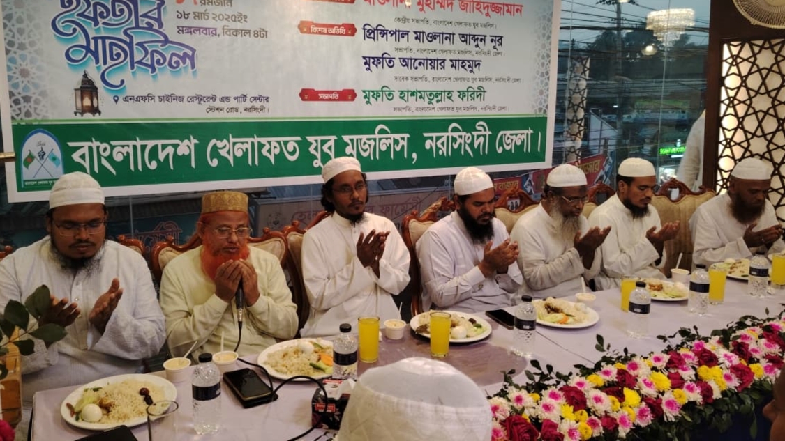 রমজানের শিক্ষা শীর্ষক আলোচনা ও ইফতার মাহফিলে যুব মজলিস নরসিংদী জেলা শাখার সভাপতি মুফতি হাশমতুল্লাহ ফরিদী এর সভাপতিত্বে প্রধান অতিথি হিসেবে উপস্থিত ছিলেন বাংলাদেশ খেলাফত যুব মজলিসের কেন্দ্রীয় সভাপতি মাওলানা মুহাম্মদ জাহিদুজ্জামান, বাংলাদেশ খেলাফত মজলিসের নরসিংদী জেলা শাখার সভাপতি মাওলানা আবদুন নূর, বাংলাদেশ খেলাফত যুব মজলিস নরসিংদী জেলার সাবেক সভাপতি মুফতি আনোয়ার মাহমুদ।