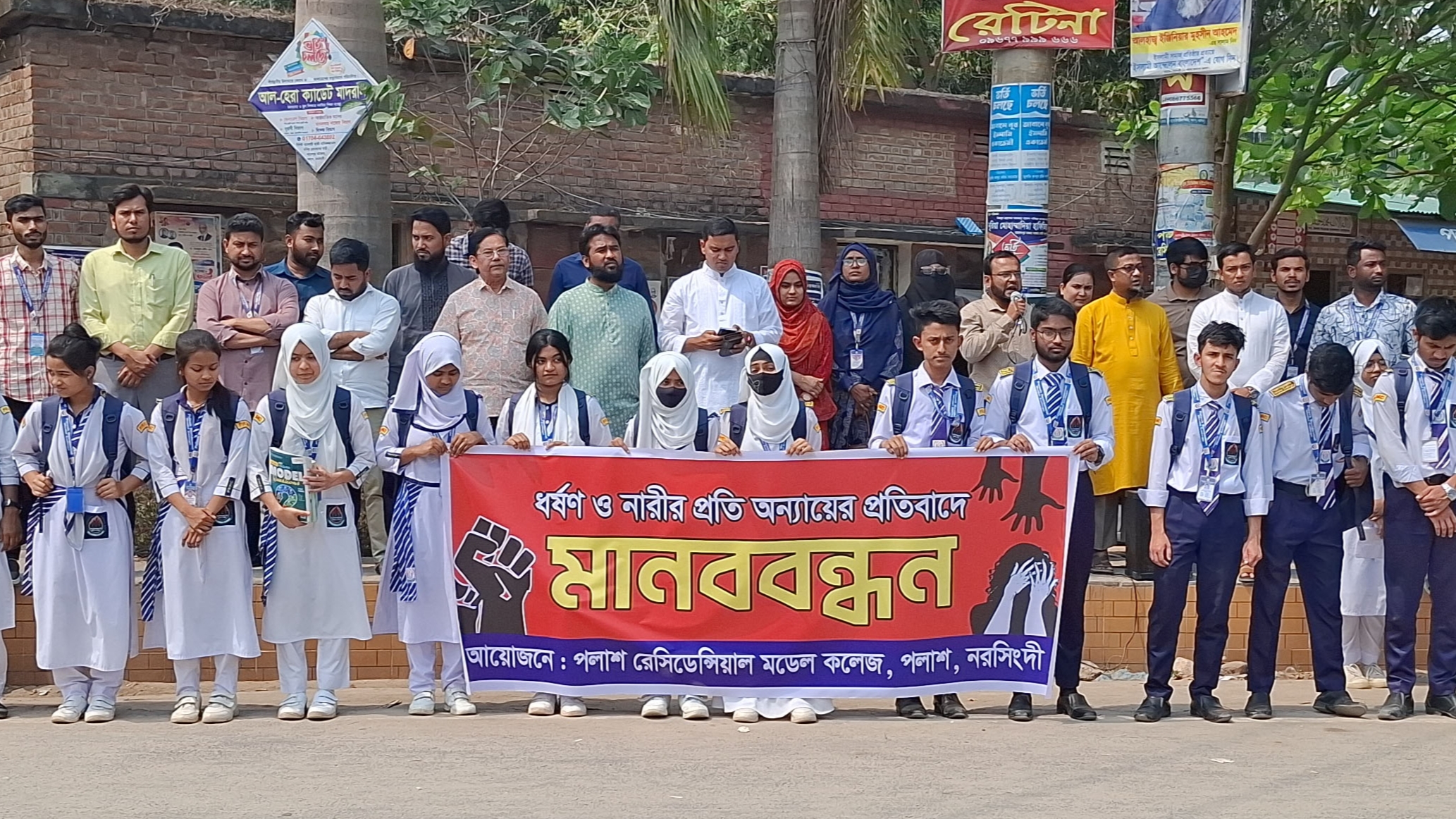 পলাশ রেসিডেন্সিয়াল মডেল কলেজের প্রতিষ্ঠাতা ও অধ্যক্ষ আরিফ পাঠানের সভাপতিত্বে মানববন্ধননে বক্তব্য রাখেন, কলেজটির সিনিয়র শিক্ষক শরিফুল ইসলাম, আলমগীর হোসেন, মেজবাহ উদ্দিন, শিতল চন্দ্র দে কলেজ শিক্ষার্থী সাদিয়া ও তৌহিদ রহমান সহ বিভিন্ন শিক্ষক ও শিক্ষার্থীরা।