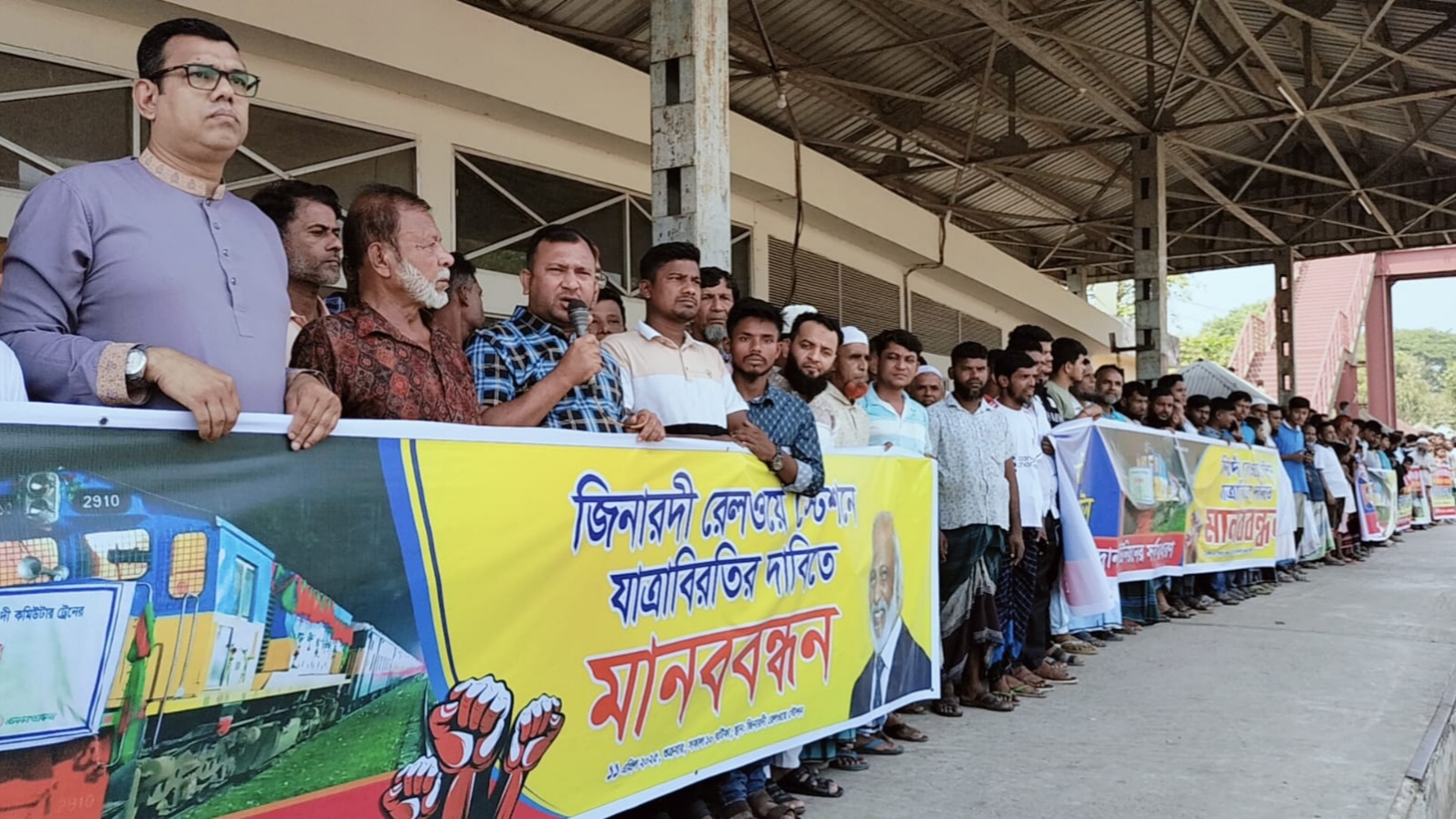 মানববন্ধনে স্থানীয়রা জানান, বাংলাদেশ রেল যাত্রা শুরু থেকে জিনারদীতে রেল স্টেশন চালু হয়। সেই সময় চার থেকে পাঁচটি ট্রেন চলাচল করলেও দুর ভাগ্যজনকভাবে এই রেল স্টেশনে এখন একদিন পরপর শুধুমাত্র কর্নফুলি ও নোয়াখালী এক্সপ্রেস ট্রেন মাত্র ৩০ সেকেন্ড করে যাত্রা বিরতি দিয়ে থাকে। এছাড়া অন্য কোন আন্তঃনগর ট্রেনের যাত্রা বিরতি না থাকায় রেল যাত্রীদের দুর্ভোগ পোহাতে হচ্ছে।