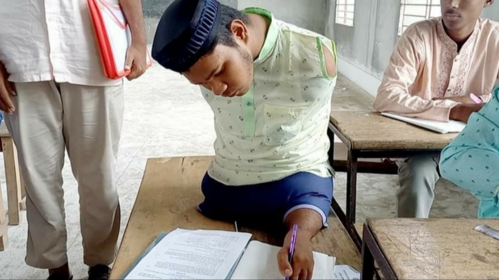 দুই হাত নেই। ডান পা-ও নেই। বাঁ পা আছে, তাও স্বাভাবিকের চেয়ে অনেকটা ছোট। পায়ের আঙুলের ফাঁকে কলম রেখে দাখিল পরীক্ষায় অংশগ্রহণ করছে হার না মানা প্রতিবন্ধী রাসেল মৃধা।