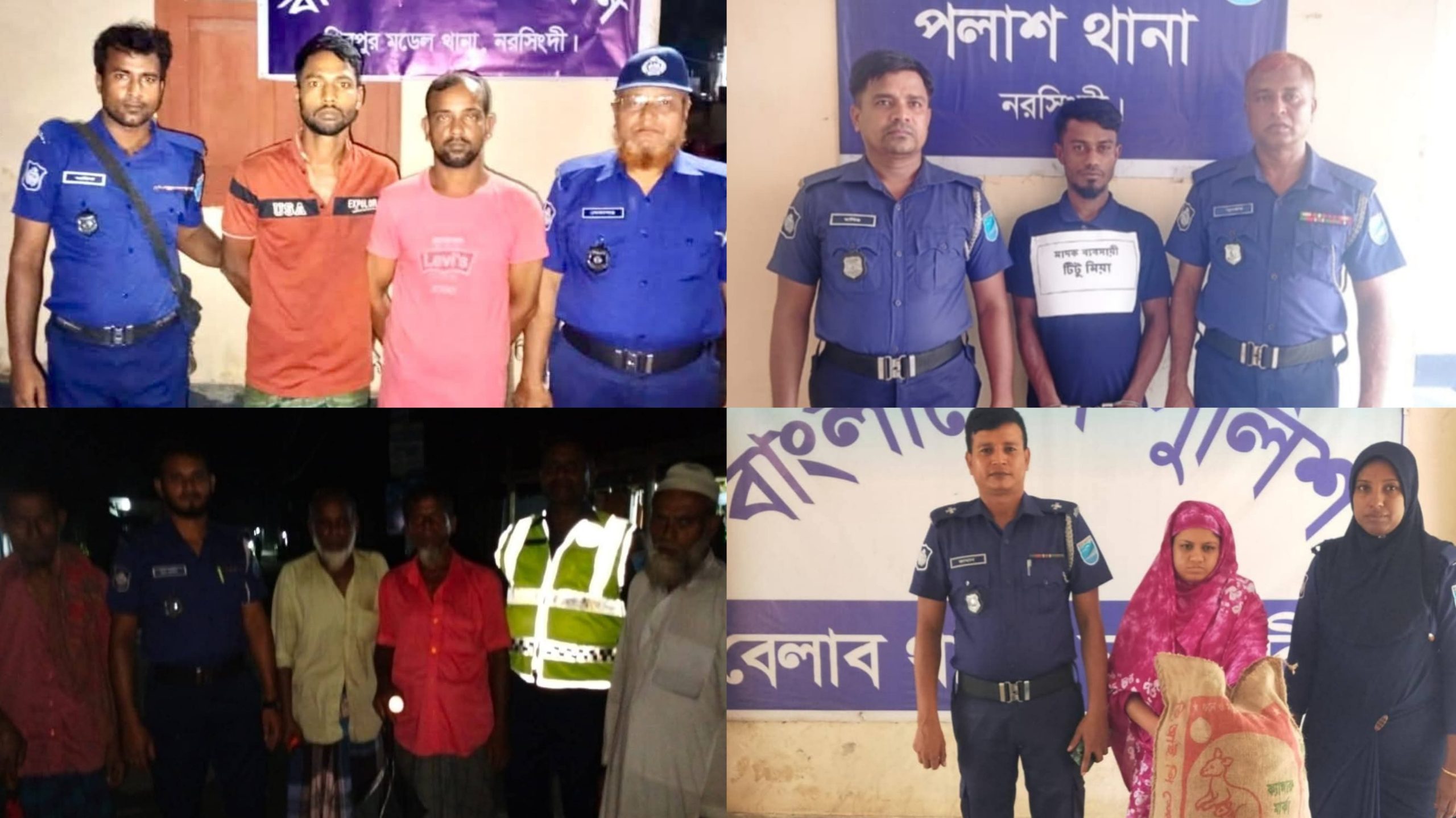 ডিবি পুলিশ (নরসিংদী): সদর থানাধীন বানিয়াছল এলাকায় ৮০ পিস ইয়াবাসহ ২ জনকে আটক করা হয়। তাদের একজন মনির মিয়ার বিরুদ্ধে রয়েছে ৫টি মামলা। পলাশ থানা : ২১ পিস ইয়াবাসহ আরও একজন মাদক ব্যবসায়ীকে গ্রেপ্তার করে পুলিশ।শিবপুর মডেল থানা : অভিযানে ধরা পড়ে দীর্ঘদিন ধরে পলাতক থাকা কুখ্যাত ডাকাত আমিন সরকার ওরফে সোহাগ ওরফে আমিন ডাকাত (২৮) এবং তার সহযোগী মঞ্জু (৩৪)। আমিন সরকারের বিরুদ্ধে রয়েছে ১৭টি মামলা, যার সবই বিচারাধীন। গ্রেপ্তারের সময় তাদের কাছ থেকে উদ্ধার করা হয় ডাকাতি কাজে ব্যবহৃত অস্ত্র।
