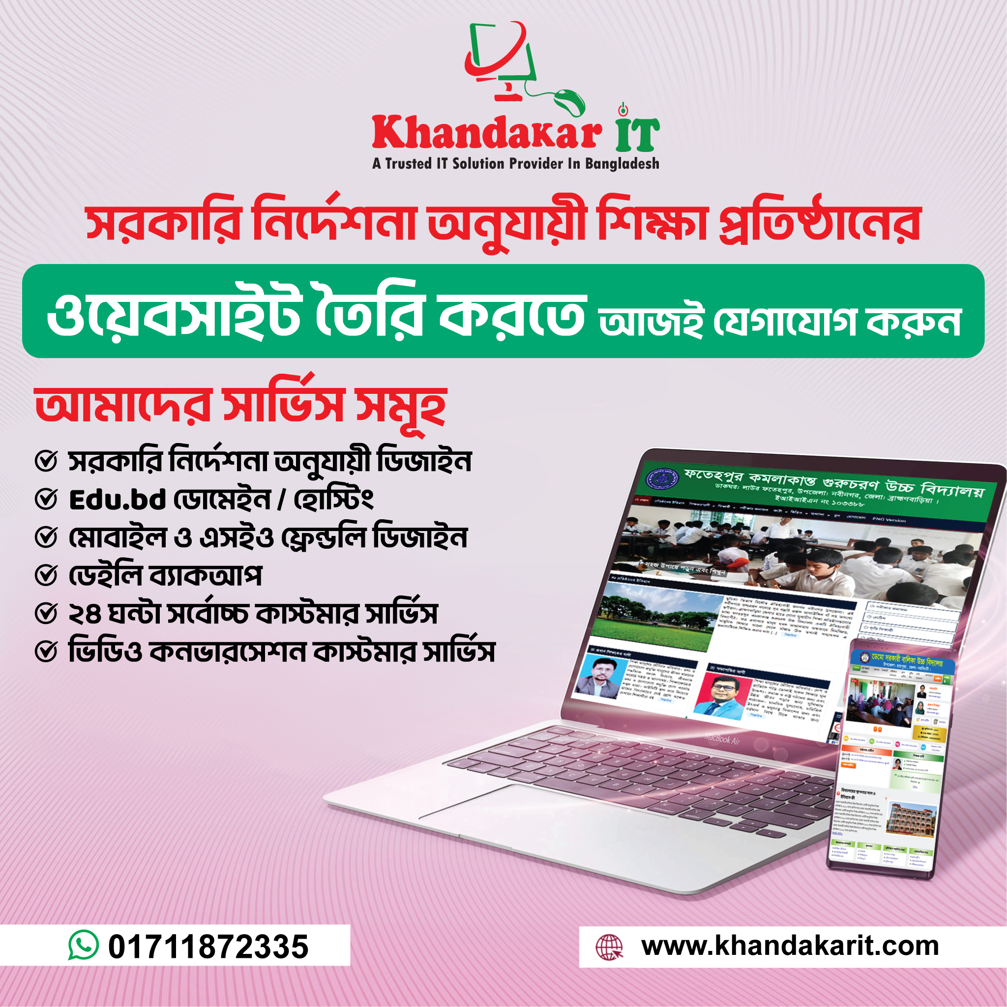 শিক্ষা প্রতিষ্ঠানের ডিজিটাল রুপান্তরের অংশ হিসেবে খন্দকার আইটি দিচ্ছে মাউশি-র নির্দেশনা অনুযায়ী edu.bd ডোমেইন ও হোস্টিং সহ পুর্নাঙ্গ স্কুল-কলেজ ও মাদ্রাসা ম্যানেজমেন্ট সহ যেকোনো ওয়েবসাইট। কোনোরকম প্রযুক্তি দক্ষতা ও পূর্ব অভিজ্ঞতা ছাড়াই খুব সহজেই ওয়েবসাইট পরিচালনা করা যায়।