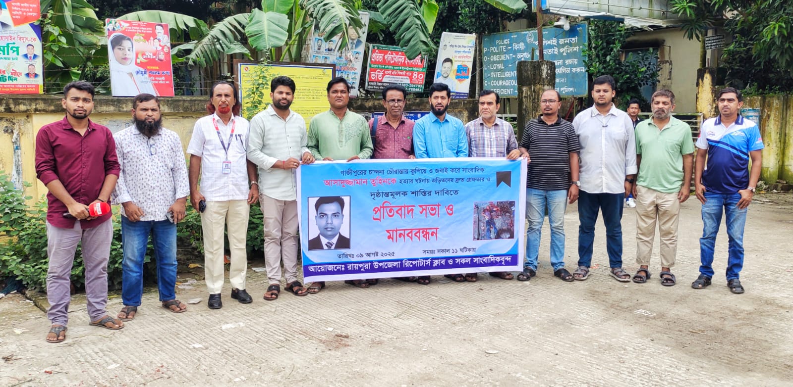 এম আজিজুল ইসলাম, নিজস্ব প্রতিবেদক: গাজীপুরের চান্দনা চৌরাস্তায় সাংবাদিক আসাদুজ্জামান তুহিনকে কুপিয়ে ও জবাই করে হত্যার ঘটনায় জড়িতদের দ্রুত গ্রেপ্তার ও দৃষ্টান্তমূলক শাস্তির দাবিতে নরসিংদীর রায়পুরায় মানববন্ধন ও প্রতিবাদ সভা করেছে উপজেলায় কর্মরত সাংবাদিকরা।