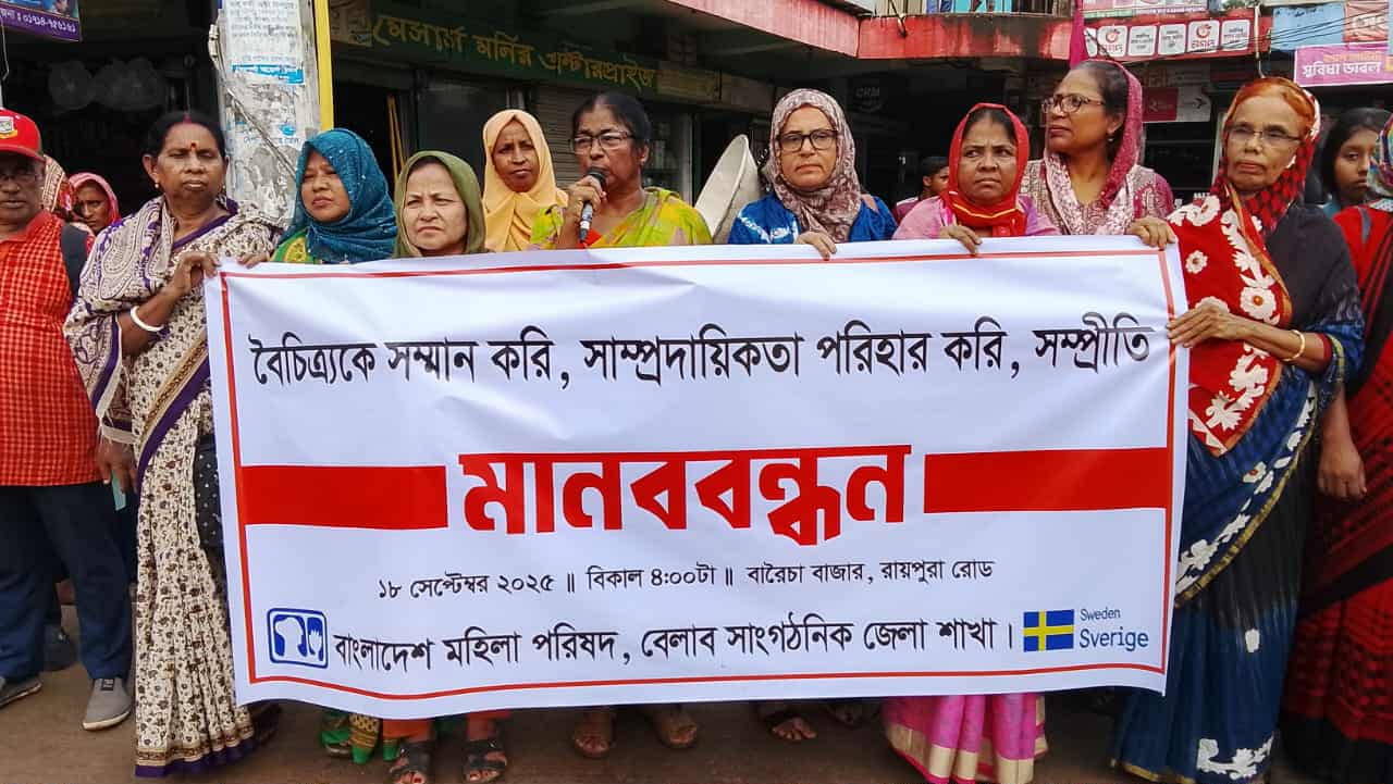 আলমগীর পাঠান, নিজস্ব প্রতিবেদক : "বৈচিত্র্যকে সম্মান করি, সাম্প্রদায়িকতা পরিহার করি, সম্প্রীতি বজায় রাখি" এই স্লোগানকে সামনে রেখে বাংলাদেশ মহিলা পরিষদ বেলাব সাংগঠনিক জেলা শাখার উদ্যোগে এক মানববন্ধন অনুষ্ঠিত হয়েছে।