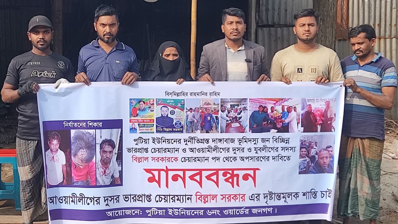 নরসিংদী প্রতিনিধি: নরসিংদীর শিবপুর উপজেলার পুটিয়া ইউনিয়নে দুর্নীতি, ভূমিদস্যুতা ও তারেক সরকার নামে এক ব্যক্তি পরিবারের উপর ওপর অমানুষিক নির্যাতনের অভিযোগ উঠেছে ভারপ্রাপ্ত চেয়ারম্যানের উপর। আজ মঙ্গলবার দুপুরে পুটিয়া ইউনিয়নের ৬নং ওয়ার্ডের মোঃ তারেক সরকারের নেতৃত্বে এই স্বৈরাচারী কর্মকাণ্ডের প্রতিবাদে মানববন্ধন অনুষ্ঠিত হয়।