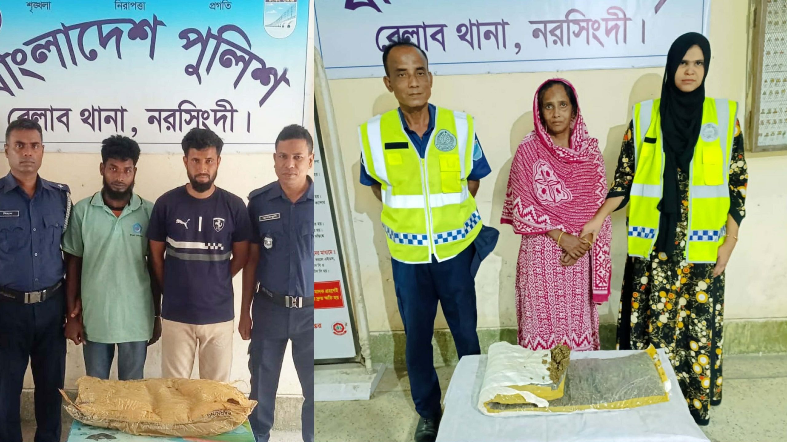 আলমগীর পাঠান, নিজস্ব প্রতিবেদক : নরসিংদীর বেলাবোতে পৃথক দুটি মাদকবিরোধী অভিযান চালিয়ে চার কেজি অবৈধ গাঁজাসহ এক নারীসহ মোট তিনজনকে গ্রেফতার করেছে থানা পুলিশ। গত ১৮ ও ১৯ এপ্রিল ২০২৬ তারিখে ঢাকা-সিলেট মহাসড়কের বারৈচা ও ধুকুন্দি এলাকায় এই অভিযানগুলো পরিচালিত হয়।