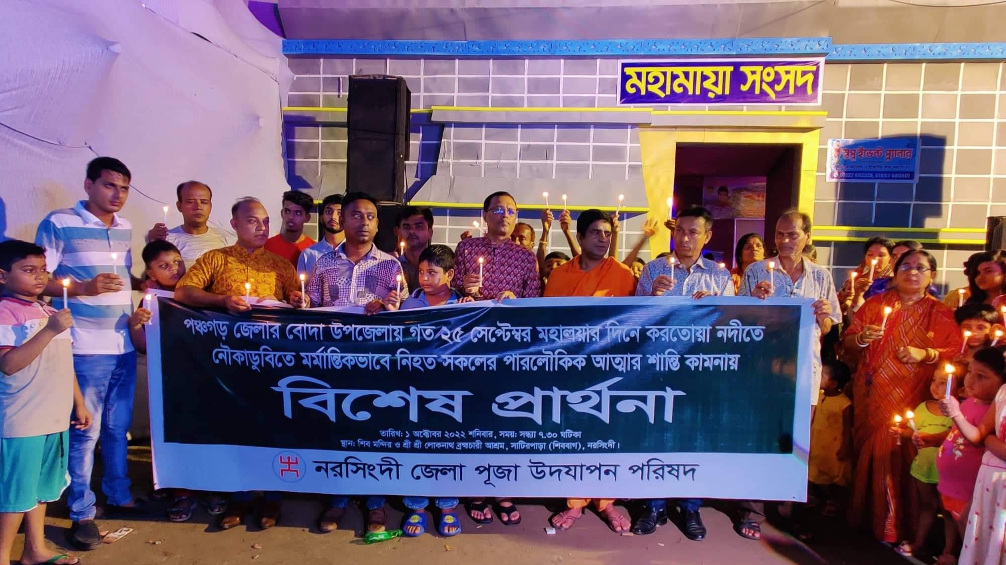সুজন বর্মণ, নরসিংদী : পঞ্চগড়ের বোদা উপজেলার করতোয়া নদীতে নৌকাডুবির ঘটনায় মৃত ব্যক্তিদের আত্মার শান্তির জন্য মন্দিরে মন্দিরে বিশেষ প্রার্থনা করেছে নরসিংদী জেলা পূজা উদযাপন পরিষদ। শনিবার রাত ০৮ টায় জেলা পূজা উদযাপন পরিষদের উদ্যোগে শহরের শিববাগ মন্দিরে এ বিশেষ প্রার্থনা করা হয়। এসময় নিহতদের স্মরণে মোমবাতি প্রজ্বলন করা হয়।