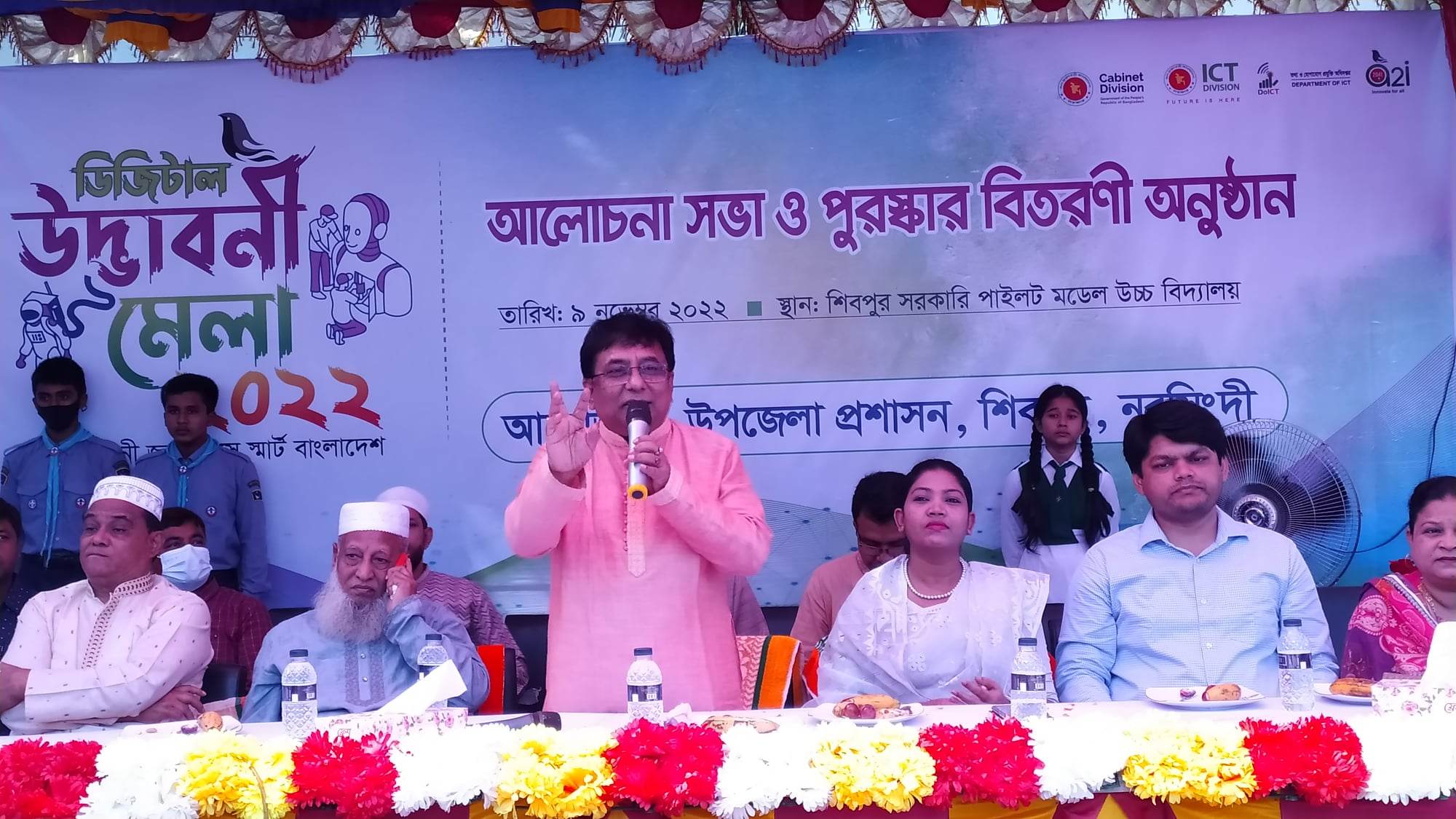 মোমেন খান, নিজস্ব প্রতিবেদক : নরসিংদীর শিবপুরে উপজেলা প্রশাসনের উদ্যোগে একদিন ব্যাপী ডিজিটাল উদ্ভাবনী মেলা অনুষ্ঠিত হয়েছে। “উদ্ভাবনী জয়োল্লাসে স্মার্ট বাংলাদেশ" স্লোগানকে সামনে রেখে বুধবার (৯ নভেম্বর) সকালে শিবপুর সরকারি পাইলট মডেল উচ্চ বিদ্যালয় মাঠে মেলা উদ্বোধন উপলক্ষে আলোচনা সভার আয়োজন করা হয়। আলোচনা সভায় সভাপতিত্ব করেন উপজেলা নির্বাহী কর্মকর্তা (ইউএনও) জিনিয়া জিন্নাত। প্রধান অতিথি হিসেবে বক্তব্য রাখেন নরসিংদী-৩ শিবপুরের সংসদ সদস্য আলহাজ্ব জহিরুল হক ভূইয়া মোহন।