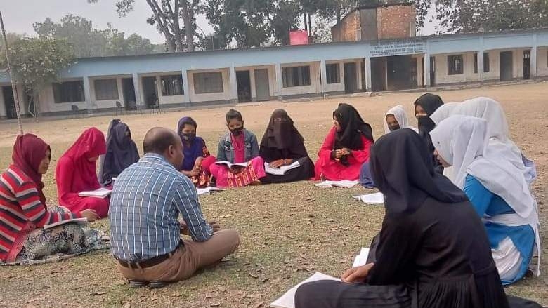 মাঠের আরেক গোলাকৃতিতে গাছের ছায়ায় মাটিতে বসে বিজ্ঞান বিভাগের জীব বিজ্ঞান বিষয়ের পাঠগ্রহণ করছিলো দশম শ্রেনীর শিক্ষার্থী সানিয়া।