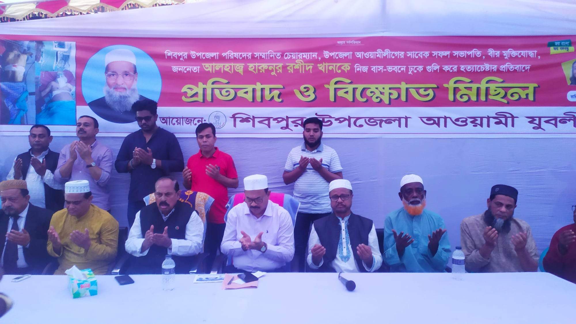 মোমেন খান, নিজস্ব প্রতিবেদক : নরসিংদীর শিবপুর উপজেলা পরিষদের চেয়ারম্যান ও উপজেলা আওয়ামীলীগের সাবেক সভাপতি হারুনুর রশীদ খানকে নিজ বাসায় ঢুকে গুলি করে হত্যাচেষ্টার প্রতিবাদে বিক্ষোভ সমাবেশ করেছে উপজেলা আওয়ামী যুবলীগ।