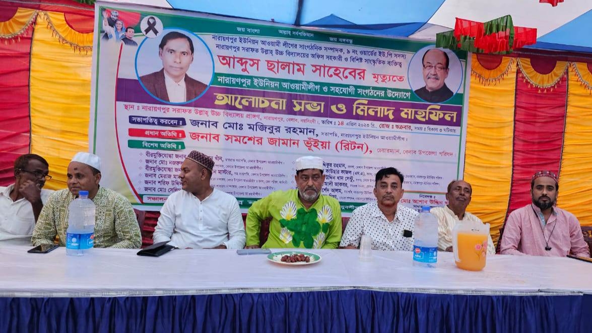 আজ (১৪ এপ্রিল) শুক্রবার বিকালে উপজেলার নারায়ণপুর সরাফত উল্লাহ উচ্চ বিদ্যালয়ের প্রাঙ্গনে নারায়ণপুর ইউনিয়ন আওয়ামী লীগ ও সহযোগী অঙ্গ সংগঠনের উদ্যােগে আলোচনা সভা ও মিলাদ মাহফিল অনুষ্ঠিত হয়েছে।