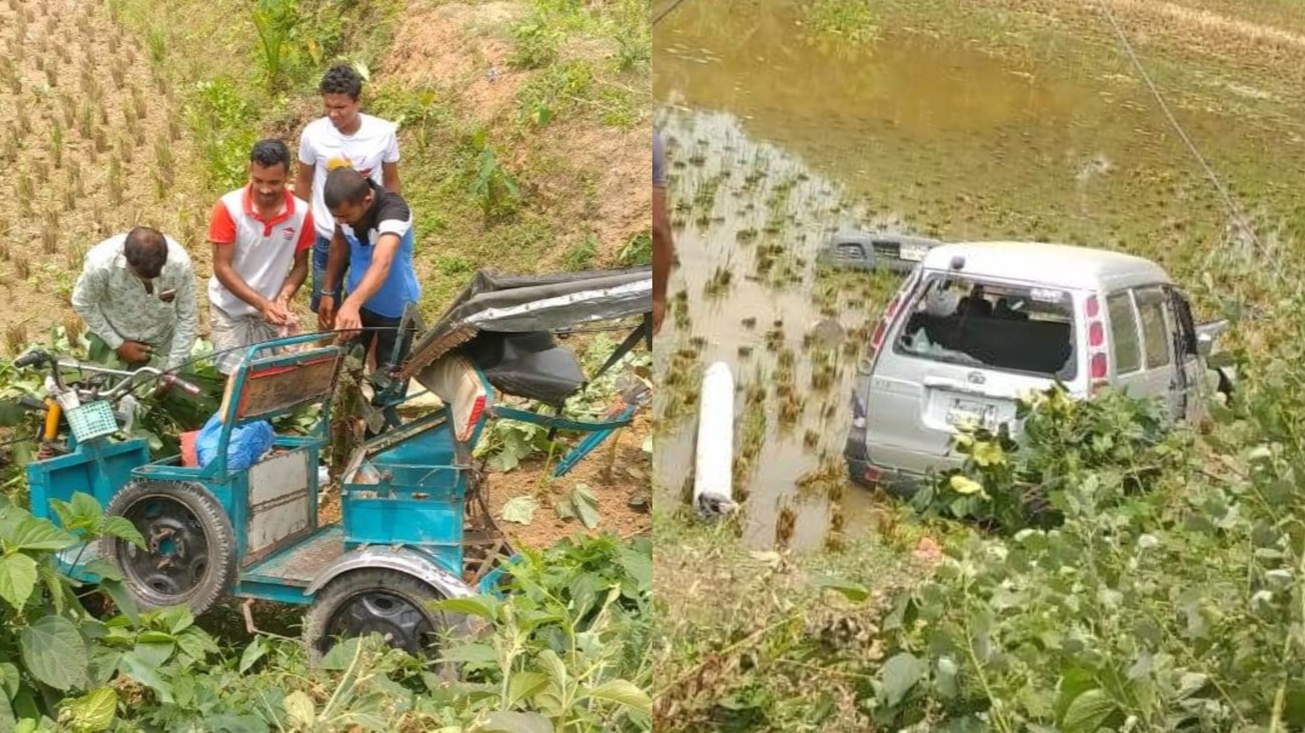 পরে মোটরসাইকেল আরোহীকে বাঁচাতে মাইক্রোবাস চালক বামদিকে সরে গেলে ইজিবাইকটির সাথে মাইক্রোবাসের সংঘর্ষ হয়। এসময় ইজিবাইক ও মাইক্রোবাস উল্টে সড়কের পাশে ধান ক্ষেতে পরে যায়। এতে এক নারী যাত্রী, মাইক্রোবাসের চালক ও ইজিবাইক চালক আহত হয়।