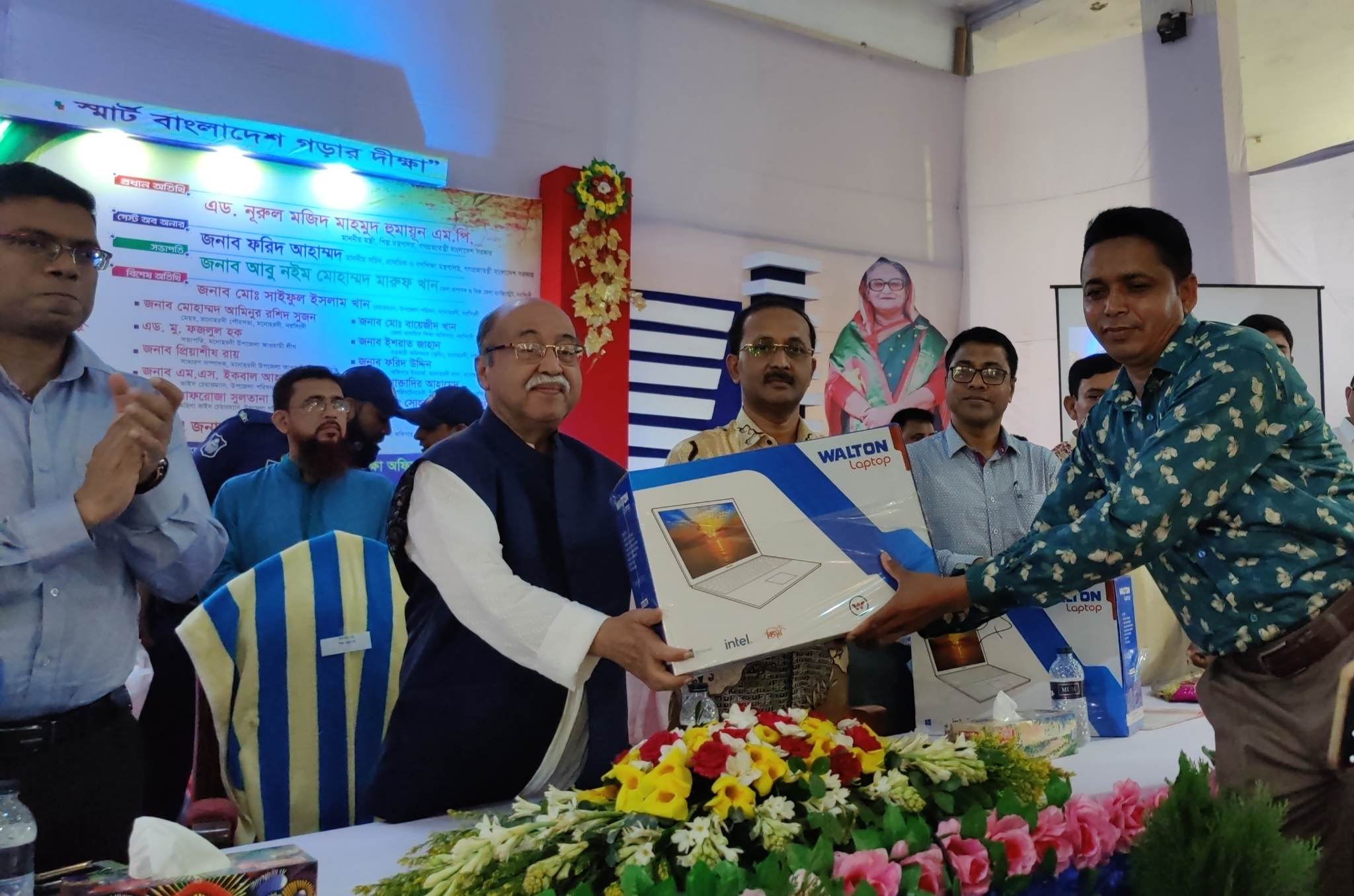 এসময় অনুষ্ঠানের প্রধান অতিথি শিল্পমন্ত্রী এ্যাড. নূরুল মজিদ মাহমুদ হুমায়ূন প্রাথমিক বিদ্যালয়ের শিক্ষকদের কাছে ল্যাপটপ হস্তান্তর করেন। শিক্ষা মন্ত্রণালয়ের উপহার হিসেবে উপজেলার ১৪৬ টি বিদ্যালয়ের মধ্যে প্রথম দফায় ১১৪ টি বিদ্যালয়ে ও আজকে ৫৪ টি সরকারি প্রাথমিক বিদ্যালয়কে মানসম্মত শিক্ষা সহায়ক ল্যাপটপ প্রদান করা হয়।