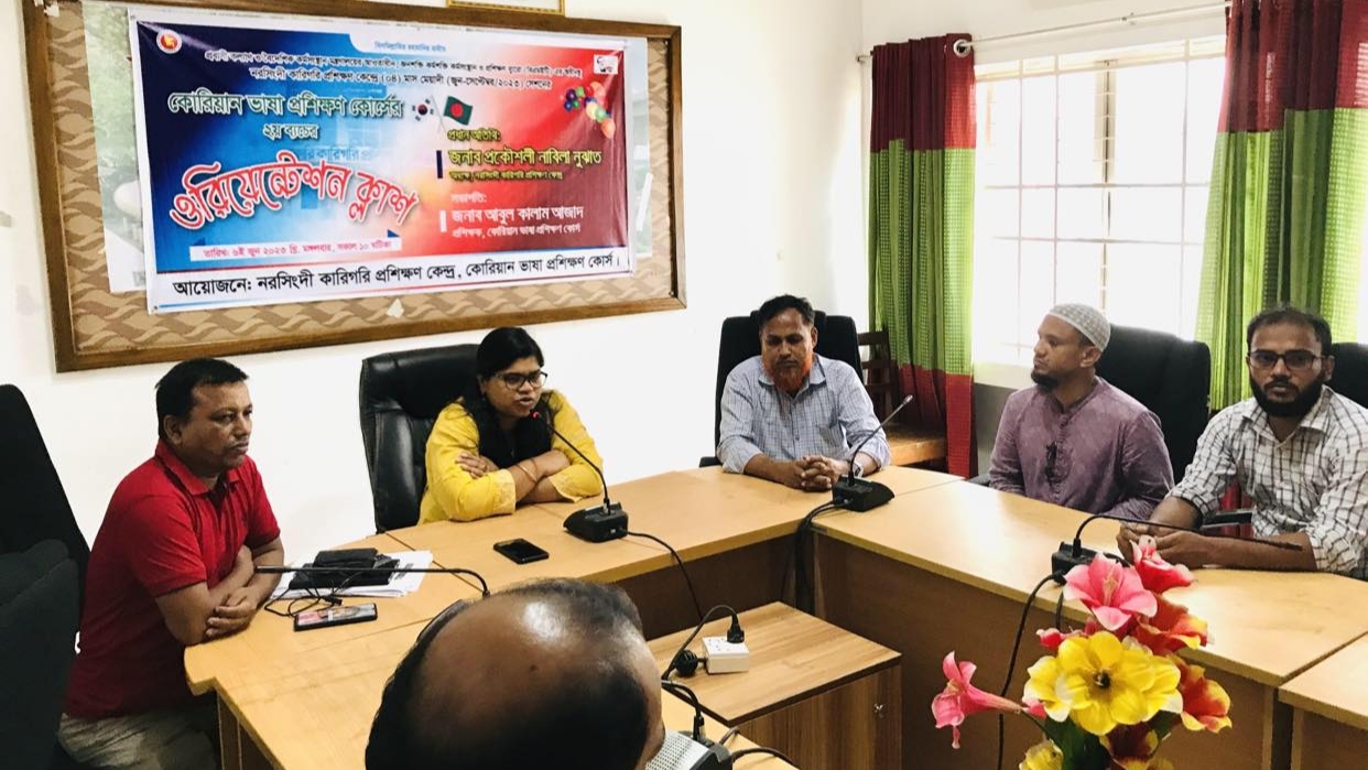 মঙ্গলবার (৬ জুন) সকালে শিবপুর উপজেলার শাষপুরে নরসিংদী কারিগরি প্রশিক্ষণ কেন্দ্রের সম্মেলন কক্ষে অনুষ্ঠিত ৪ মাস মেয়াদী (জুন থেকে সেপ্টেম্বর ২০২৩) সেশনের কোরিয়ান ভাষা প্রশিক্ষণ কোর্সের ২য় ব্যাচের ৫০ জন শিক্ষার্থী ওরিয়েন্টেশন ক্লাসে অংশগ্রহণ করেন।