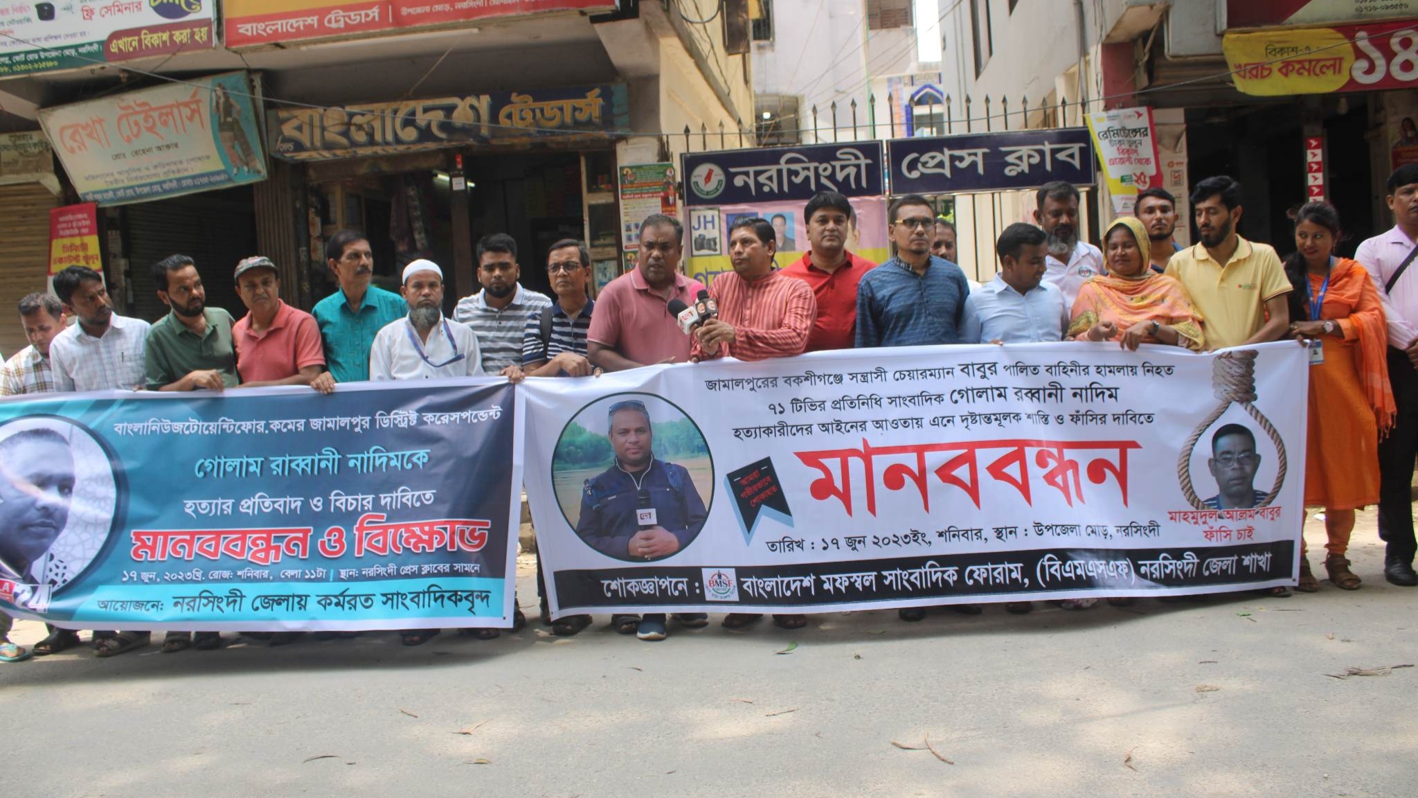 আজ শনিবার সকাল ১১ টায় নরসিংদী প্রেসক্লাবের সামনে এ মানববন্ধন অনুষ্ঠিত হয়। মানববন্ধনে নরসিংদী প্রেস ক্লাব, সম্পাদক পরিষদ, জেলা রিপোর্টাস ক্লাব, বাংলাদেশ মফস্বল সাংবাদিক ফোরাম নরসিংদী শাখা, রায়পুরা প্রেস ক্লাব সহ জেলার বিভিন্ন সংগঠনের সাংবাদিকরা অংশগ্রহণ করে।