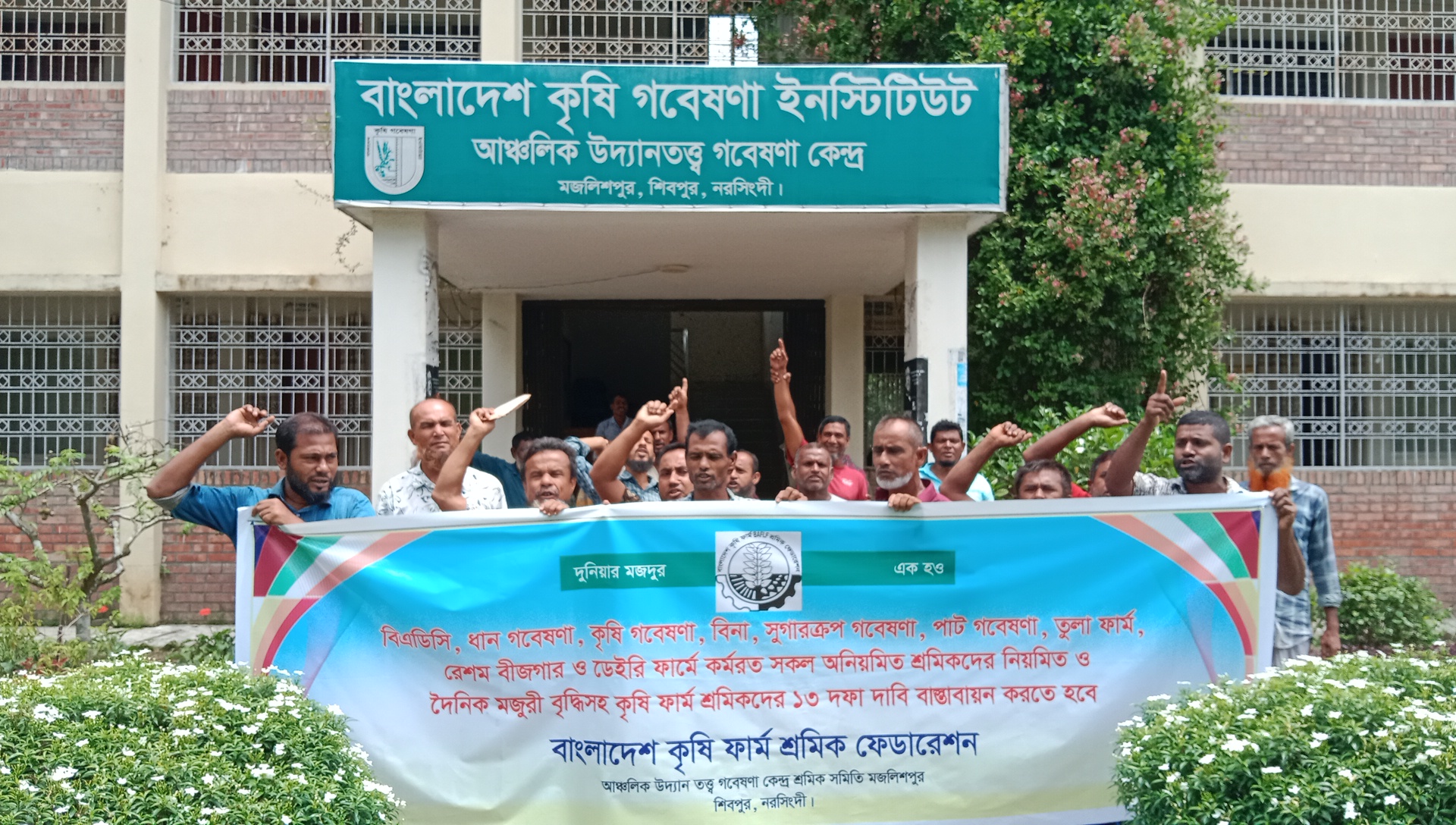 শেখ মানিক : বাংলাদেশ কৃষি ফার্ম শ্রমিক ফেড়ারেশন নরসিংদীর শিবপুর উপজেলার বাংলাদেশ কৃষি গবেষণা ইনস্টিটিউট আঞ্চলিক উদ্যানতত্ব গবেষণা কেন্দ্রে কর্মরত সকল অনিয়মিত শ্রমিকদের নিয়মিত করণ ও দৈনিক মজুরী বৃদ্ধি সহ কৃষি ফার্ম শ্রমিকদের ১৩ দফা দাবি বাস্তবায়নে লক্ষে ১০ দিনের কর্মসূচী ঘোষণা করেন কৃষি ফার্ম শ্রমিক ফেডারেশন।