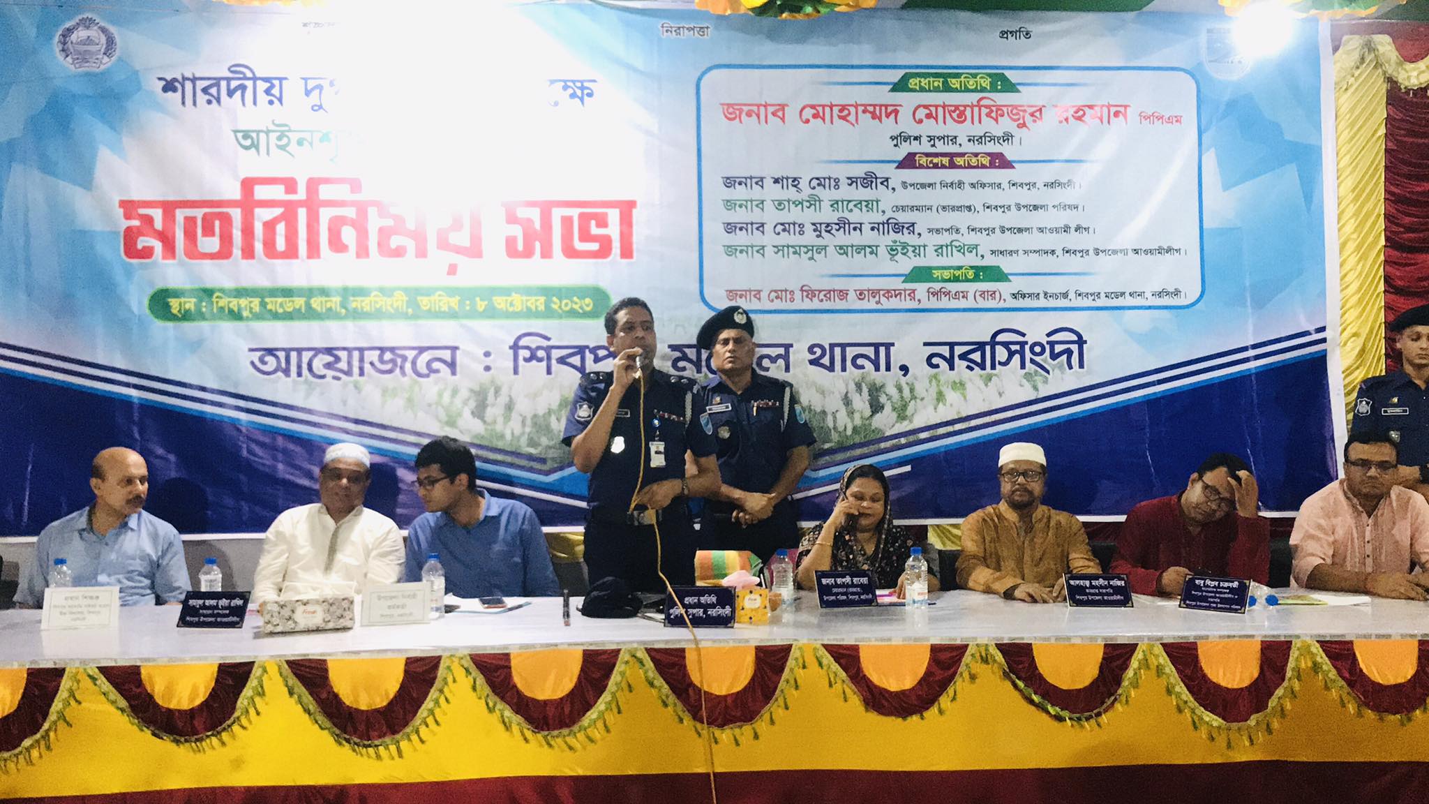 মোমেন খান, নিজস্ব প্রতিবেদক : নরসিংদীর শিবপুর মডেল থানার আয়োজনে সনাতন ধর্মালম্বীদের সবচেয়ে বড় উৎসব শারদীয় দুর্গোৎসব উপলক্ষে আইনশৃঙ্খলা বিষয়ক মতবিনিময় সভা অনুষ্ঠিত হয়েছে। রবিবার (৮ অক্টোবর) সন্ধ্যায় শিবপুর মডেল থানা প্রাঙ্গনে এ সভা অনুষ্ঠিত হয়।