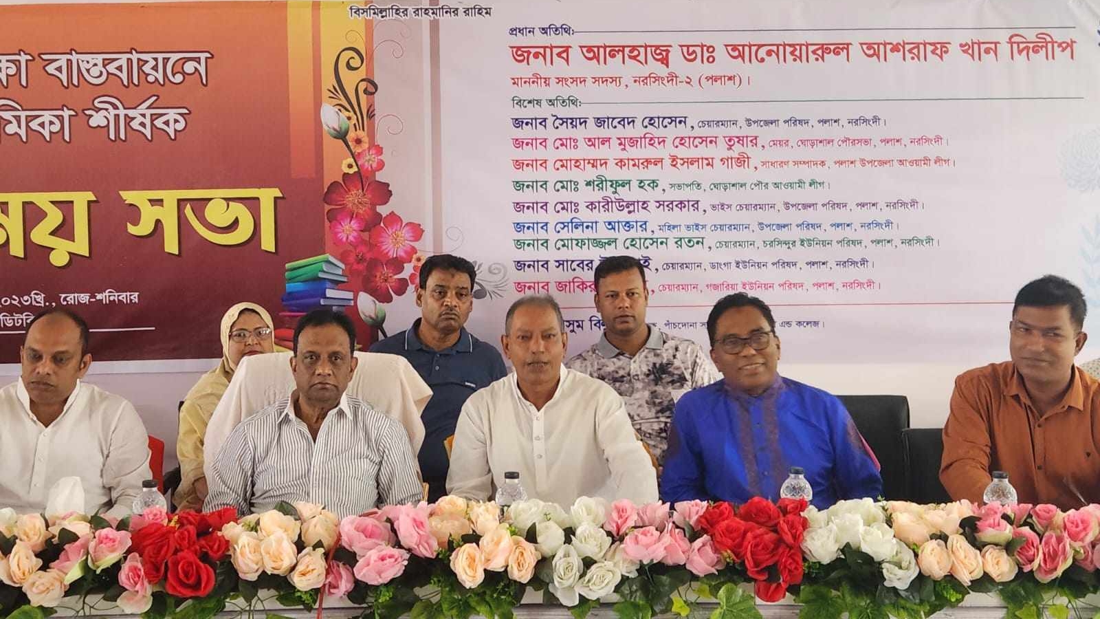 পাঁচদোনা স্যার কেজি গুপ্ত স্কুল এন্ড কলেজের অধ্যক্ষ মাসুম বিল্লাহের সভাপতিত্বে অনুষ্ঠিত সভায় প্রধান অতিথি হিসেবে উপস্থিত ছিলেন পলাশের এমপি ডাঃ আনোয়ারুল আশরাফ খান দিলিপ।