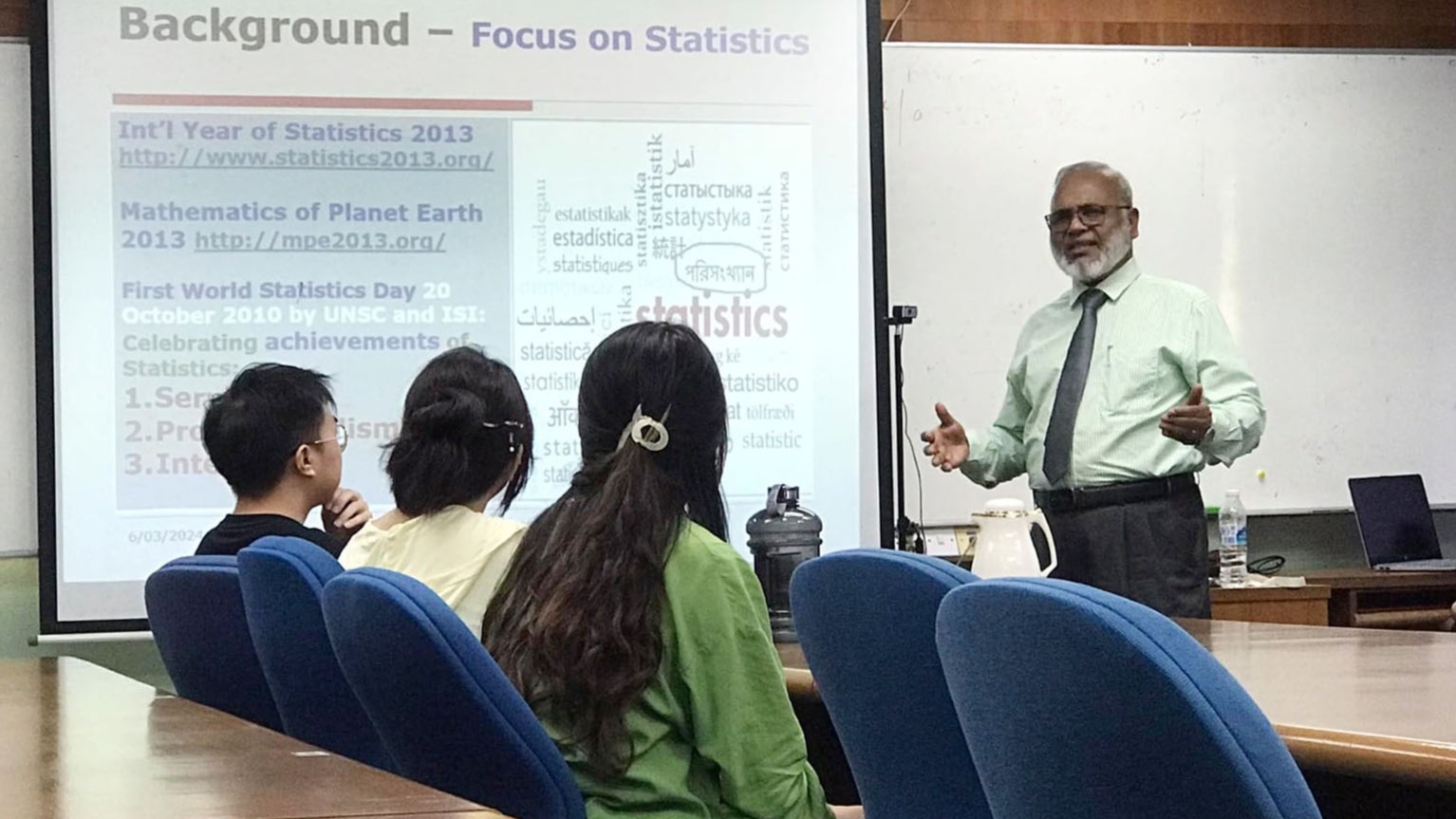 প্রফেসর খান পরিসংখ্যানে তাদের বিএসসি অনার্স এবং এমএসসি প্রোগ্রামগুলি মূল্যায়ন করে প্রোগ্রামের ফলাফল পর্যালোচনা, কোর্সের বিষয়বস্তু, বিতরণ পদ্ধতি, শিক্ষাগত সুবিধা এবং সংস্থান, অনুষদের যোগ্যতা এবং নিযুক্তি, তত্ত্বাবধান এবং অ-তত্ত্বাবধানহীন মূল্যায়ন, লাইব্রেরি এবং ইলেকট্রনিক সংস্থান এবং প্রাক্তন ছাত্রদের প্রতিক্রিয়া সহ প্রোগ্রামগুলির পাঠ্যক্রমের মূল্যায়ন করবেন।