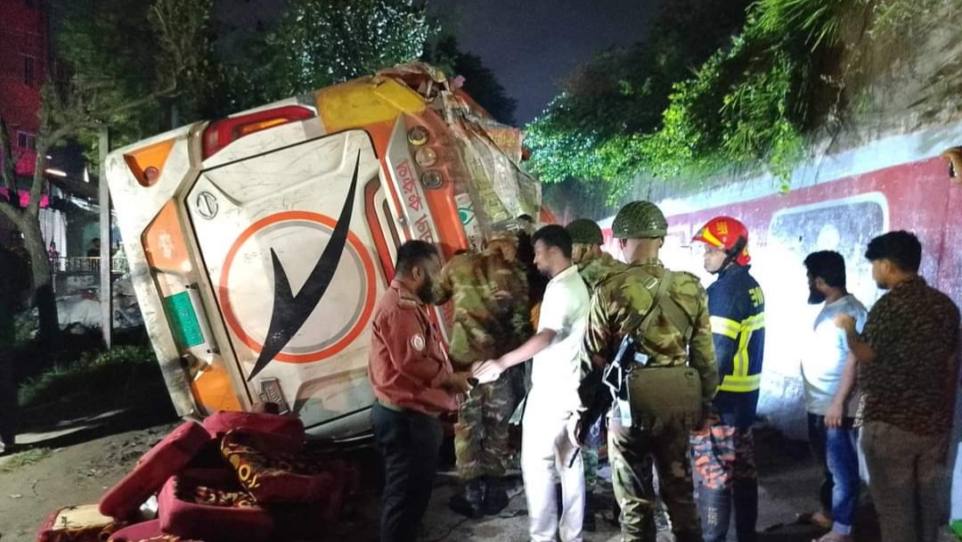 প্রত্যক্ষদর্শীরা জানান, সিলেটগামী ঢাকা এক্সপ্রেসের বাসটি একটি ট্রাককে ওভারটেক করতে গিয়ে আরেকটি ট্রাকের সামনে পড়ে। এ সময় বাসের চালক নিয়ন্ত্রণ হারিয়ে ওভারপাসের প্রায় ৩০ ফিট নিচে পড়ে যায়। ঘটনাস্থলেই একজন নিহত হন।