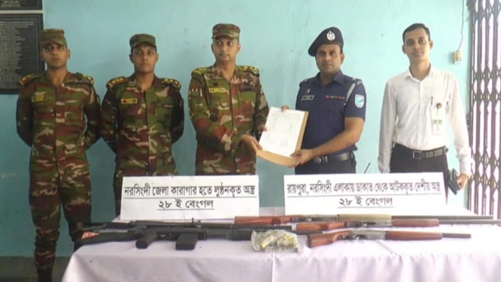 এসময় নরসিংদী ক্যাম্পের দায়িত্বে নিয়োজিত ২৮ইষ্ট বেঙ্গল সেনাবাহিনীর লেফটেন্যান্ট কর্ণেল মোহাম্মদ ফাহিম মাহবুব জানান, গতকাল জেলার চিনিশপুর গ্রামে অভিযান চালিয়ে জেলা কারাগার থেকে লুট হওয়া একটি শটগান ও একটি রাইফেল উদ্ধার করা হয়।